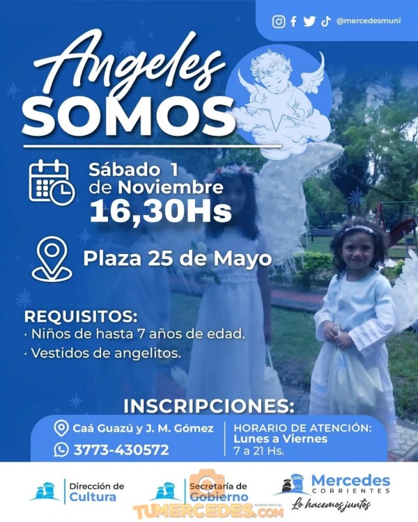 Las inscripciones se efectúan en la Oficina de la Dirección de Cultura, calles Caá Guazú y José María Gómez, o enviando un mensaje al teléfono celular 3773-430572, cuyos requisitos son vestir de angelitos y las edades que oscilen entre 0 a 7 años.