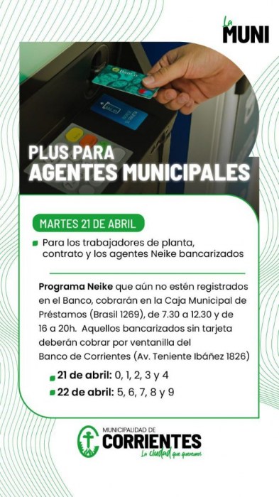 En tanto, los Neike bancarizados pero que aún no posean tarjeta de débito, deberán cobrar por ventanilla del Banco de Corrientes (sucursal av. Teniente Ibáñez 1826) de acuerdo al cronograma detallado anteriormente.
