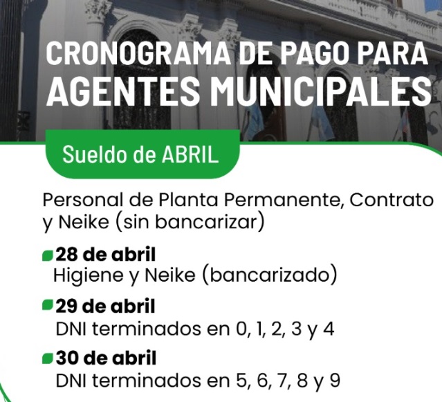 El cronograma salarial de la Municipalidad, correspondiente al mes de abril, se extenderá hasta el jueves 30 y será de manera extraordinaria en la previa al Día del Trabajador. Este martes 28 de abril se pagar&aacut...